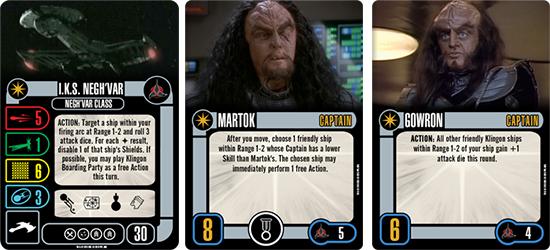 The I.K.S. Negh’Var is a powerhouse with a Primary Weapon Value of 5, 1 Agility, 6 Hull and 3 Shields. The Evade and Cloak Actions will insure the Negh’Var’s survival while the Sensor Echo and Target Lock Actions provide maneuverability and raw firepower. The ship’s named ability allows you, as an Action, to target a ship within your firing arc at Range 1-2 and roll 3 attack dice. For each [Hit] result, disable 1 of that ship’s Shields. If possible, you may play Klingon Boarding Party as free Action this turn.