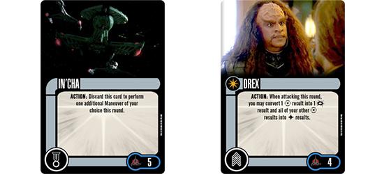 Martok or any other Captain with an Elite Talent Upgrade slot, can add an Elite Talent Upgrade to their ship. The Elite Talent in this expansion is In’cha. As an Action, you may discard this card to perform one additional Maneuver of your choice this round. Extra movement is always helpful, but if used at just the right moment, In’cha can be the difference between victory or defeat.