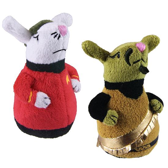 Wobble Mouse Cat Toys that will be available in the next week or two. There's a Red Shirt version and also a Klingon version. Made of polyester and plastic, with a steel weighted bottom meant to keep the mouse upright during play, each product includes a bell inside and is designed to satisfy cat preying instincts. The Cat Toys each measure 3.75"H by 2"D and they're priced at $9.95 apiece. Go to www.thecoopshop.com to pre-order.