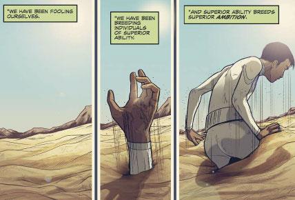 These panels introduce another aspect of Khan’s character: his unrelenting determination. It’s one thing to possess incredible intelligence and unmatched physical capability, but in Khan those attributes are combined with an indomitable spirit. Call it drive, ambition, or a simple innate need to survive (as seen most emphatically in THE WRATH OF KHAN); whatever you call it, it is what separates Khan from his fellow Augments and makes him a leader.