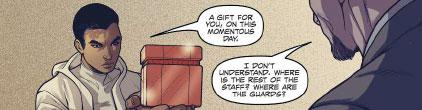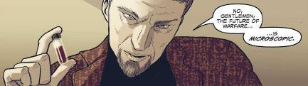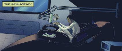 Here we meet Dr. Heisen, the creator of the Augment program. We wanted to give the program a face and a name, rather than leave it an anonymous entity. The reference to eugenics in this scene is deliberate, an echo of the Nazis’ obsession with genetic perfection and the evil that drove their experiments. In the case of the Augment program, that evil is cloaked in talk of the profits that can follow from “progress.”